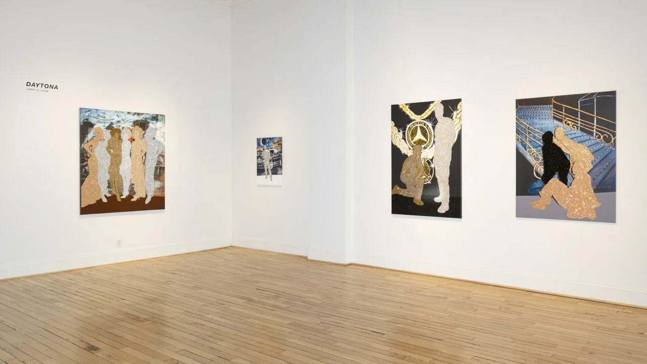 Daytona includes works from Larry Cook’s most recent mixed media series, in which the artist has elevated vernacular club imagery into grand artworks using rhinestones and glitter. His subjects shimmer against backdrops with imagery representing aspirational luxuries, nodding to Black expression, and, as Cook states, “representing the transformation of self within the ephemeral space of club culture.”