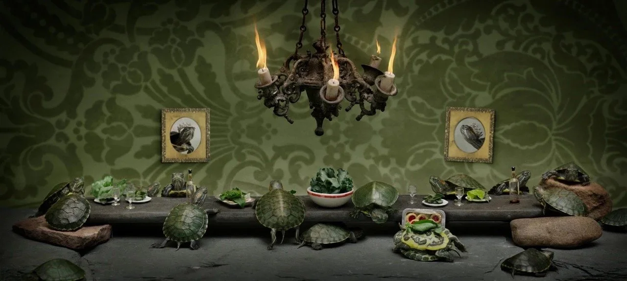 In the grand sets of Claire Rosen’s Fantastical Feasts, various animals are presented dining at tables overflowing with their favorite foods. As a distinctly human ritual associated with status and elegance, the formal banquet, via iconography of The Last Supper, encourages viewers to consider those in the animal kingdom more humanly, affording them more rights and status. The feasts invite viewers to reflect on the nature of society, our relationship and responsibility to the creatures with which we share the planet.